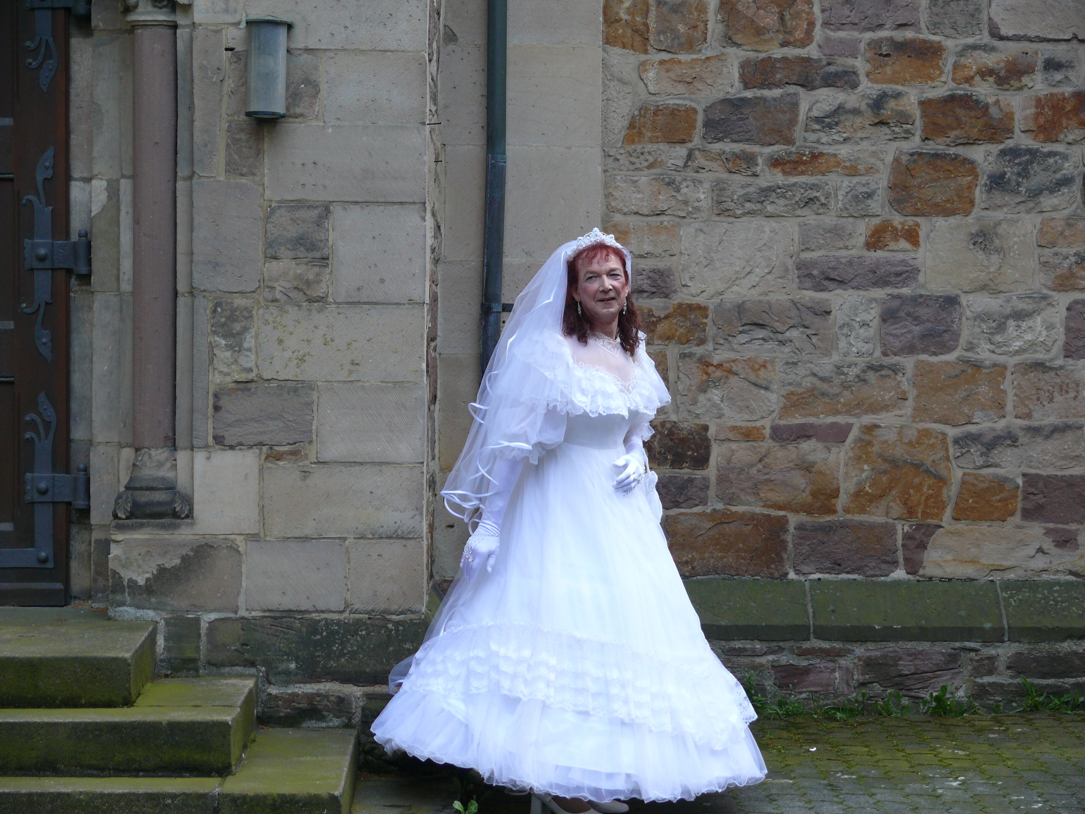 Das fand mitten in Kassel statt und anders als geplant. Wir wollten das eigentlich etwas außerhalb der Stadt irgendwo im Grünen machen, möglichst abgelegen. Nur hatte es die Tage vorher intensiv geregnet, alles war matschig, kein geeigneter Ort für diese Kleidung. Also dorthin, wo man festen und trockenen Boden unter den Füßen hat und das war eben nur mitten in der Stadt möglich. Meine gute Freundin, die mir das ermöglicht hat, hatte ein Geschäft in der Stadt in dem ich mich umziehen konnte. Und ihr Partner hat uns dann zu dieser Kirche gefahren damit wir dann die Bilder machen konnten. Dabei musste ich feststellen, dass es schon sehr schwierig ist, mit einem Reifrock in ein Auto zu steigen.